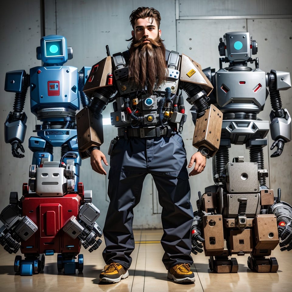 Par exemple, voici ce que j’obtiens en promptant : “un homme chauve barbu entourné par 3 robots”