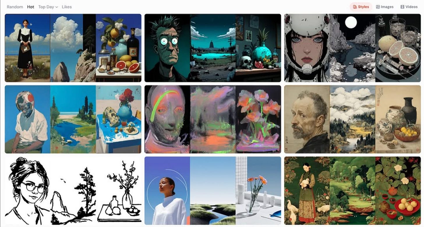Midjourney, qui a maintenant un compte Instagram depuis cet été, a lancé son Style Explorer, une page qui permet de parcourir un grand nombre de styles visuels, de les sauvegarder en favoris et de les rechercher grâce à un moteur intégré pour les appliquer instantanément à leurs créations. Approuvé par le camarade expert Nicolas Fensch de Geniart, qui pense malgré tout que cela reste perfectible. A suivre.