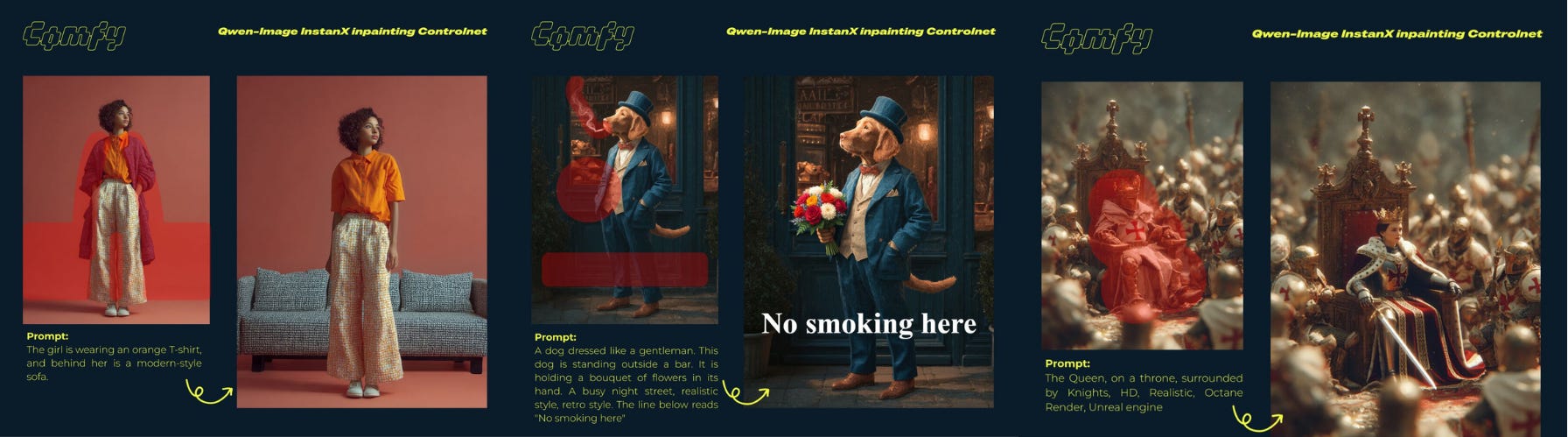 ComfyUI intègre désormais nativement Qwen-Image InstantX avec support ControlNet, permettant des retouches d’images professionnelles. Les adeptes du local peuvent remplacer des objets, modifier du texte, changer l’arrière-plan ou peindre de nouveaux éléments directement dans leurs flux de travail avec un contrôle local comparable aux méthodes traditionnelles de retouche, mais avec la rapidité et la flexibilité de l’IA générative.